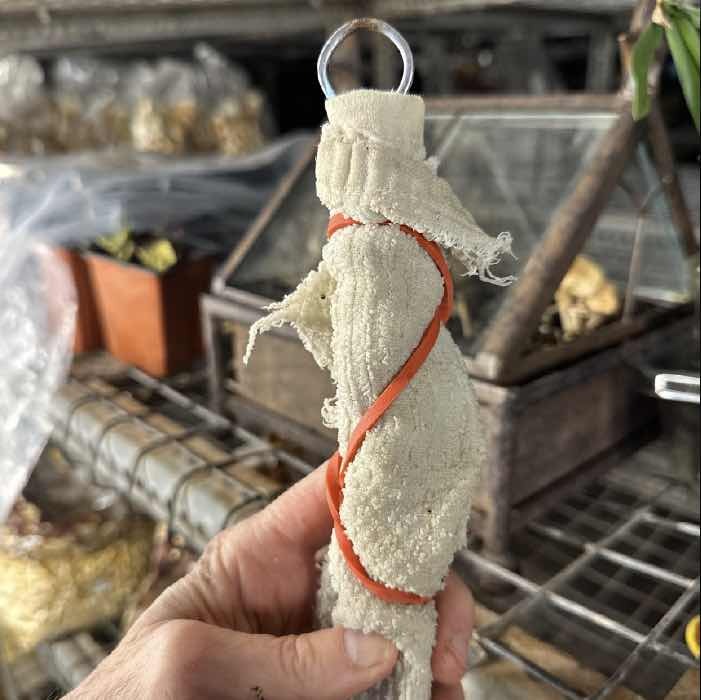 Skewers can also be wrapped with terry cloth or microfiber towels. These “humidity socks” are surprisingly effective but only for blocks that are tented or surface fruit on the top, such as King, Back Pearl, Reishi or Pioppini. The instructions with these kits recommend cutting the plastic bag off only at the very top because the filter patch bag itself is excellent at keeping the humidity localized. These varieties can also tolerate high levels of CO2 which works great with the high bag cut which doesn't allow for much air exchange. Simply wrap a square of towel around the skewer, fasten it with a string or rubber band, soak it in water and plant the sharp end into the top of the kit. Usually the cloth will only need soaking every other day and dispenses humidity slowly and evenly.