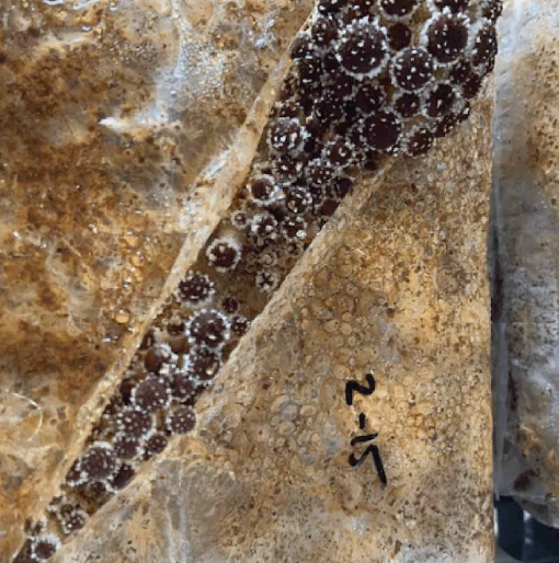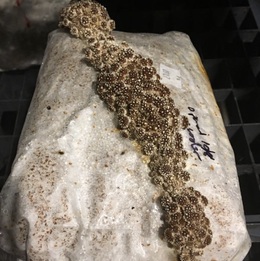 On occasion, mushrooms will begin developing in the trapped humid space between the block and the bag (Figure 3). If you notice any mushroom pins developing underneath the plastic bag, gently cut the plastic open over the small mushrooms to allow them more growing space (Figure 4).