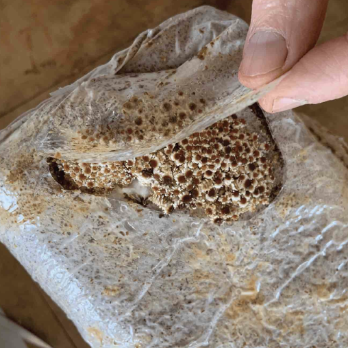 Your grow room should be temperature and humidity controlled. If the humidity is lower than recommended, you should mist the blocks as needed. Chestnut blocks require monitoring - they can be prone to bacterial and green mold contamination if humidity exceeds 85%, however, if conditions are too dry, they will abort and stop growing. Tiny mushroom pins will begin to develop 12-25 days after opening (Figure 2).