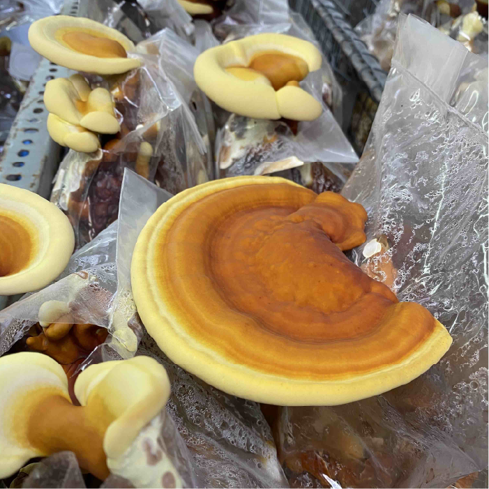 Reishi can be harvested at any growth stage by cutting them off at the base with a sharp pair of scissors. Conched Reishi mushrooms release a very high spore load - it will look like rust colored dust coming from the top of the cap. Ideally, you should harvest mushrooms before this happens. Reishi blocks fruit only once, so consider adding the block to the compost pile after harvesting.